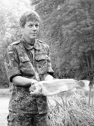 Donnerstag morgen aus dem vereinseigenen Angelteich zog. Ein kleines Maiskorn an feiner Schnur führte zu diesem Erfolg - und nach zwanzig Minuten Drill hat Müller den großen Fisch gelandet. Wenn die